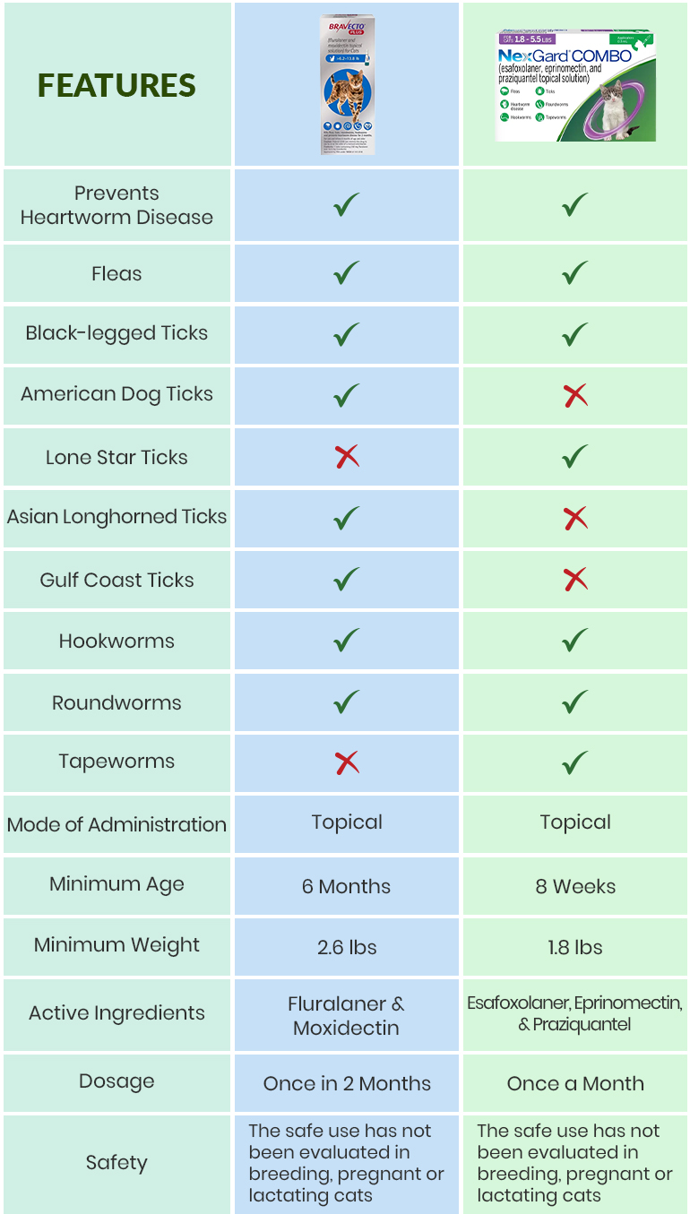 If you want coverage against heartworm disease, fleas, black-legged ticks, hookworms, and roundworms, you can use either of the products. However, if you are looking for protection against American dog ticks, Asian longhorned ticks, and Gulf Coast ticks, you will have to opt for Bravecto Plus. For coverage against lone star ticks and tapeworms, you will have to go with NexGard Combo. However, make sure your cat meets the minimum age and weight requirements specified on the product labels.