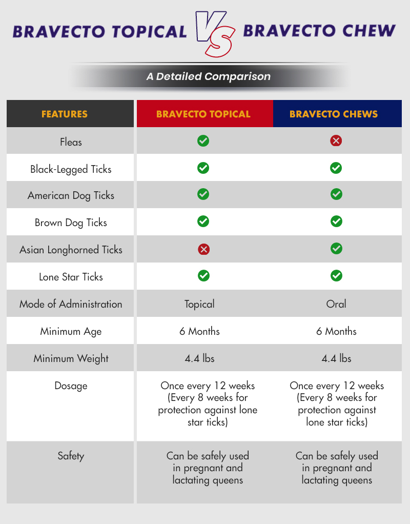 A Detailed Comparison. The following table offersoffers a comparison of the product features of Bravecto Topical and Bravecto Chews.