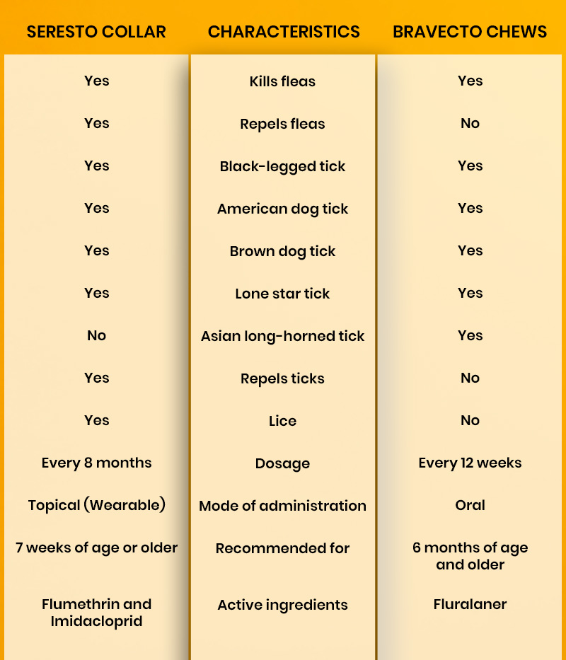 - Seresto Collar kills chewing lice, which Bravecto Chews don’t. On the other hand, Bravecto Chews cover Asian long-horned ticks, which Seresto Collar doesn’t.